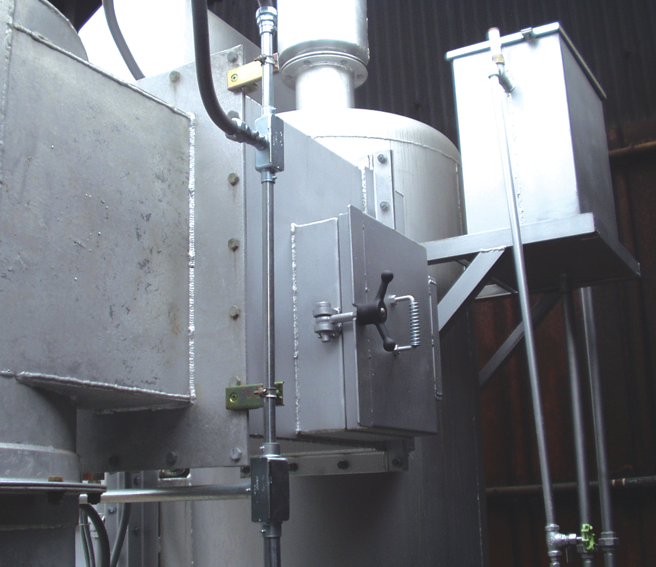 燃焼熱がジャケット部の水に吸収され、炉内の温度が一定に保たれるため炉本体に負をかけません。また集塵機内に耐火材をライニングしてあり、より一層耐久性を向上させています。